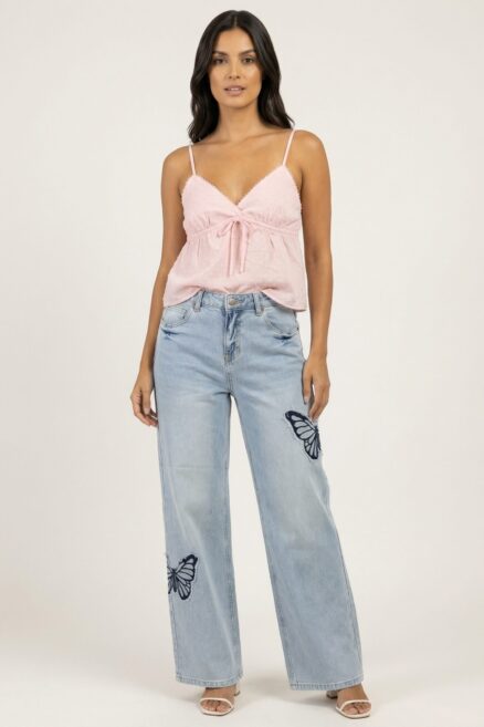 Jeans pierna ancha con bordado de mariposas