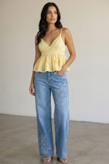 Jeans wide leg con bordados de flores