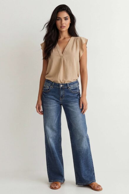 Jeans pierna ancha talle alto con pasa fajas doble D. Jeans