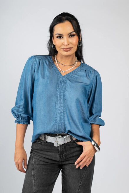 ₡22,900.00Blusa en denim liviano con detalle elástico en las mangasSMLXL -
