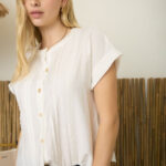 Blusa de diseño moderno con cuello redondo, cierre de botones al frente y mangas cortas con fruncidos.