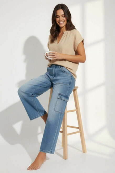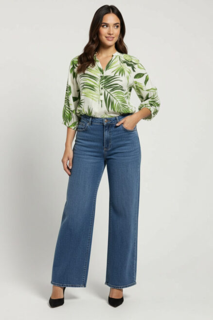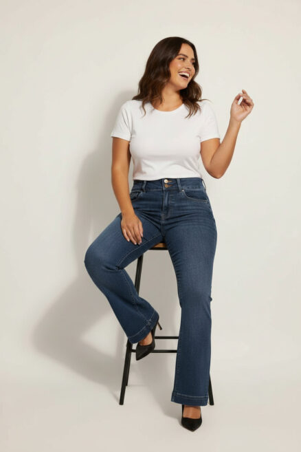 Jeans corte bota con ruedo ancho moldeador de glúteos y doble botón D. Jeans